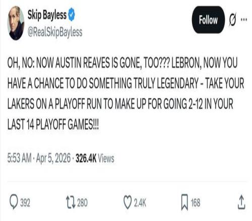 名嘴Skip則施壓到:“詹姆斯,現(xiàn)在正是你創(chuàng)造真正傳奇的絕佳機會,帶領你的湖人在季后賽中強勢突圍,以彌補你過去14場季后賽2勝12負的慘淡戰(zhàn)績!”