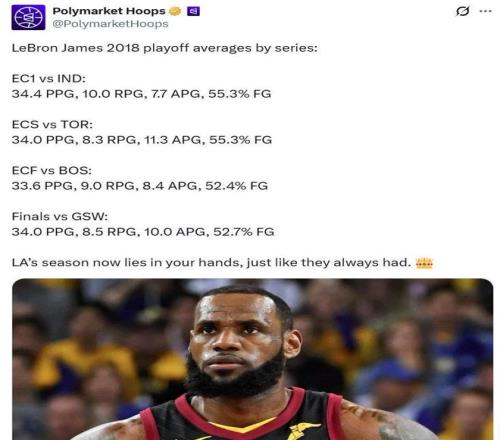 美媒Polymarket Hoops曬出18年“滅霸詹”數(shù)據(jù)配文道:“湖人的命運掌控在你的手中,正如往常一樣?!?/p>