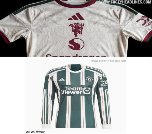 這款球衣的主色調(diào)為米白色,深綠、酒紅色進(jìn)行搭配,該配色組合與曼聯(lián)23-24賽季的客場球衣類似,但設(shè)計風(fēng)格截然不同。