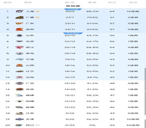 此外,浙江稠州金租、青島國信水產(chǎn)分別以20勝14 負位列 7、8 位;寧波町渥憑借3連勝升至第9,山西汾酒、遼寧本鋼以18勝16負分列 10、11 位。墊底的四川金強則依舊難求一勝,以0勝34負的戰(zhàn)績排名最后。
