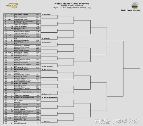北京時間昨晚,ATP1000蒙特卡洛大師賽公布了單打正賽簽表。衛(wèi)冕冠軍阿爾卡拉斯與辛納、茲維列夫、穆塞蒂位列前四號種子。前八大種子對位:上半?yún)^(qū),阿爾卡拉斯vs布勃里克、穆塞蒂vs德米納爾;下半?yún)^(qū),梅德維德夫vs茲維列夫、阿利亞西姆vs辛納。