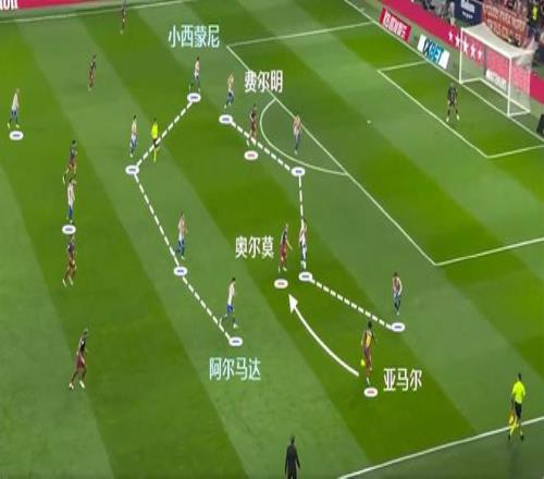 奧爾莫在這個(gè)位置,他轉(zhuǎn)身比萊萬更快,巴薩連續(xù)傳遞的效果也更好。關(guān)鍵是馬競(jìng)在面對(duì)這樣的進(jìn)攻時(shí),他們的兩個(gè)邊前衛(wèi)需要深度退防,加大馬競(jìng)由守轉(zhuǎn)攻的難度,也需要更長(zhǎng)的跑動(dòng)距離。