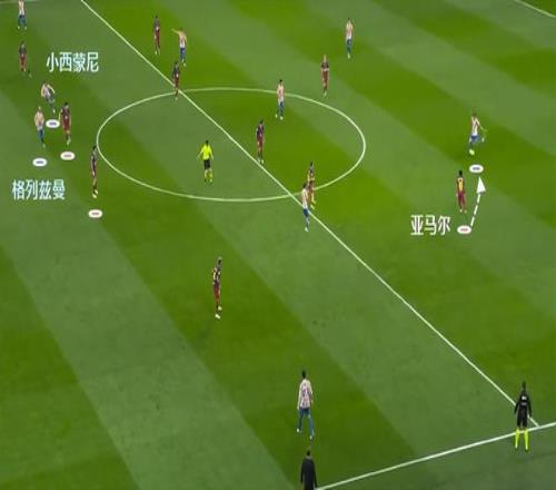 西蒙尼的馬競(jìng)在對(duì)戰(zhàn)巴薩時(shí)的思路,就是球隊(duì)并沒有真正的前鋒,格列茲曼突前是為了在肋部接應(yīng),打擊巴薩中衛(wèi)和邊后衛(wèi)的結(jié)合部,為自己邊前衛(wèi)前插提供機(jī)會(huì)。