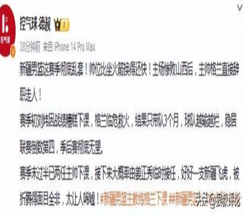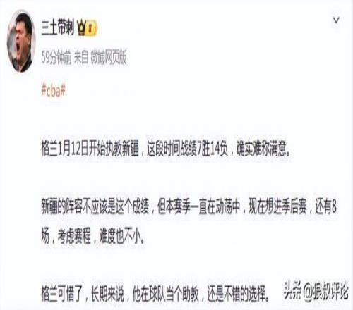 媒體人“三土帶刺”發(fā)文點(diǎn)評(píng):格蘭1月12日開(kāi)始執(zhí)教新疆,這段時(shí)間戰(zhàn)績(jī)7勝14負(fù),確實(shí)難稱滿意。