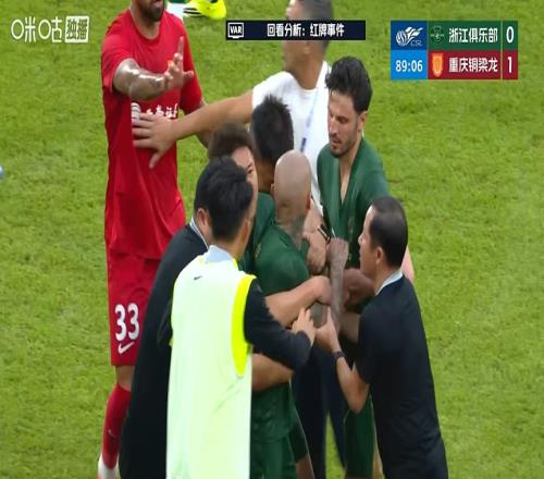 比賽第88分鐘,浙江外援米特里策用手拉李鎮(zhèn)全頭發(fā),主裁查看VAR后直紅將米特里策罰下。米特里策非常憤怒,還想要沖上前去,隊(duì)友趕緊把他拉住。
