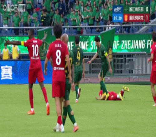 第34分鐘,浙江前場(chǎng)左路定位球,米特里策主罰直接爆射,皮球擊中阮奇龍頭部,后者痛苦倒地,隊(duì)醫(yī)光速進(jìn)場(chǎng)↓