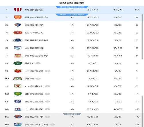 4輪過(guò)后的積分榜,排在前二的成都蓉城和重慶銅梁龍保持著不敗,成都蓉城積10分繼續(xù)領(lǐng)跑,重慶銅梁龍則積8分重新回到次席,兩隊(duì)僅有2分之差。云南玉昆、遼寧鐵人、深圳新鵬城以及大連英博則同積6分,分列積分榜第3至第6。