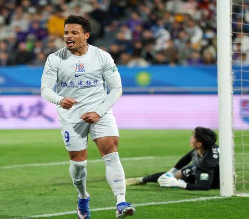 4月5日,上海申花隊(duì)球員拉唐(左)在比賽中命中點(diǎn)球后慶祝。新華社記者 孫凡越 攝