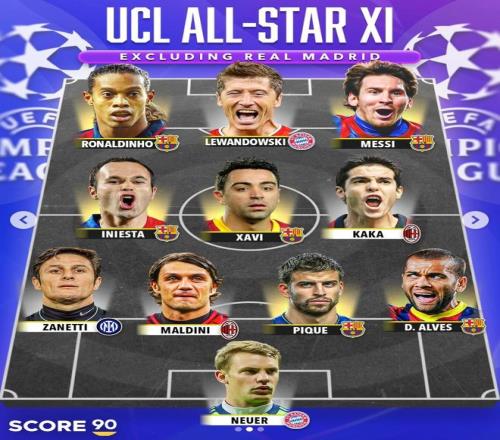 北京時(shí)間4月6日,Score90列出了自1992-93賽季改制以來(lái)歐冠的全明星陣容,C羅和梅西領(lǐng)銜,皇家馬德里占據(jù)8席。