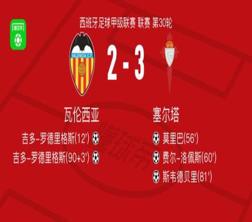 北京時(shí)間4月5日西班牙足球甲級(jí)聯(lián)賽 聯(lián)賽 第30輪,瓦倫西亞主場(chǎng)對(duì)陣塞爾塔。瓦倫西亞吉多-羅德里格斯梅開(kāi)二度。塞爾塔莫里巴破門(mén),費(fèi)爾-洛佩斯破門(mén),斯韋德貝里破門(mén)。最終比分瓦倫西亞 2-3 塞爾塔。
