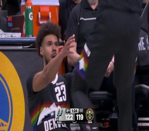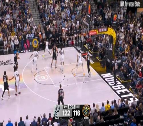 ——第四節(jié)剩下1分24秒前,掘金116-122落后馬刺6分,卡梅倫約翰遜接約基奇?zhèn)髑颍哆M(jìn)三分并且造成??怂狗敢?guī)。