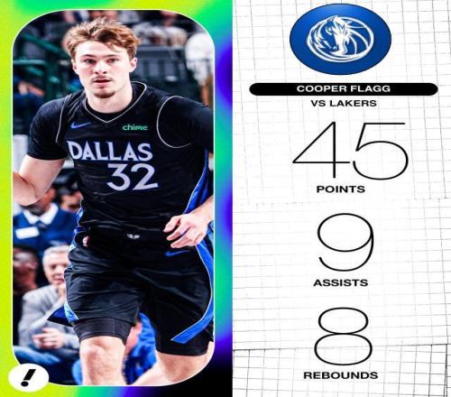全場(chǎng)比賽,弗拉格轟下45分8籃板9助攻,加上此前一戰(zhàn)他拿到51分,連續(xù)兩戰(zhàn)合計(jì)96分令弗拉格成為張伯倫之后連續(xù)2場(chǎng)得分最高的新秀。這也是他生涯第4次40+,超越詹姆斯成為NBA歷史不滿20歲砍40+最多的球員。