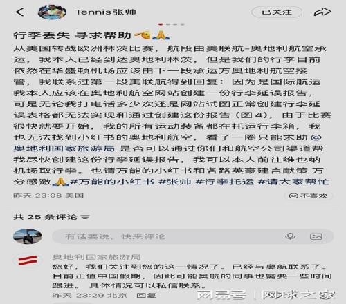 另外,張帥在飛抵奧地利林茨之后突然發(fā)現(xiàn),自己的行李不見蹤影。經(jīng)查詢發(fā)現(xiàn),行李居然還在華盛頓,沒有隨機(jī)到達(dá)。比賽即將開打,張帥在多方聯(lián)系未果的情況下,無(wú)奈通過(guò)小紅書向奧地利國(guó)家旅游局求助。截至目前,奧地利國(guó)家旅游局已經(jīng)回復(fù)收到,并正在處理中。