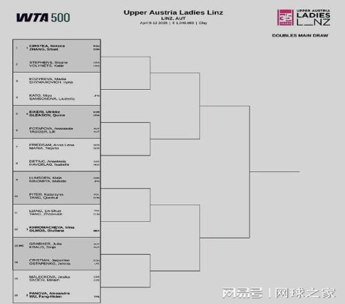 我們?cè)賮?lái)關(guān)注WTA500林茨站。北京時(shí)間昨晚,本站賽事的雙打簽表出爐,中國(guó)老將張帥與羅馬尼亞人科斯蒂亞搭檔出戰(zhàn),首輪對(duì)陣美國(guó)組合斯蒂芬斯/沃利內(nèi)茨。湯千慧、楊釗煊 梁恩碩等中國(guó)球員也將參賽。