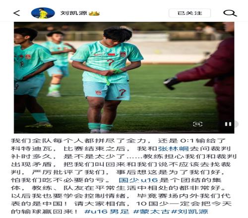 國少u16是個(gè)團(tuán)結(jié)的集體,教練、隊(duì)友在平常生活中相處的都非常好。以后我也要學(xué)會控制情緒,畢竟賽場內(nèi)外我們代表的是中國!請大家相信,10國少一定會把今天的輸球贏回來!