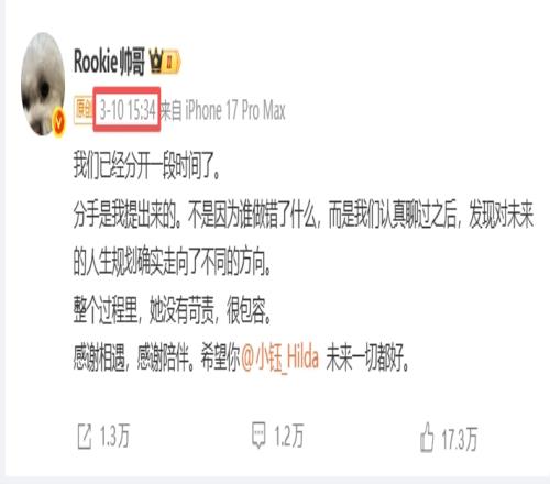 而Rookie是在3月10號(hào)才官宣與小鈺分手結(jié)束9年感情,還不到一個(gè)月Rookie就被曝出新戀情。