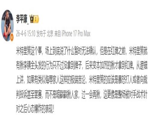 米特里策這個事,場上到底說了什么暫時無法確認(rèn),但是在紅牌之前,米特里策就有揪李鎮(zhèn)全頭發(fā)的行為只不過沒拿到牌子,后來變本加厲的揪才拿到紅牌。從邏輯上講,如果有類似侮辱家人這樣的極端言論,米特里策的應(yīng)該是暴怒打人或者向裁判投訴甚至罷賽,而不是暗戳戳揪人家,過一會再揪,這更像是整場被對手戰(zhàn)術(shù)針對之后心態(tài)爆炸的表現(xiàn)!
