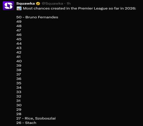 足球數(shù)據(jù)網(wǎng)站squawka統(tǒng)計(jì)了2026年至今英超球員創(chuàng)造機(jī)會(huì)的次數(shù),其中,曼聯(lián)隊(duì)長(zhǎng)布魯諾-費(fèi)爾南德斯斷崖第一,德克蘭-賴斯、索博斯洛伊27次并列第二。