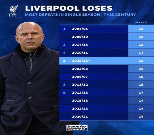 4月6日,德國轉會市場網(wǎng)站列出了利物浦本世紀單賽季輸球場次排行,利物浦本賽季已輸16場(含社區(qū)盾點球大戰(zhàn)告負),位列第五。