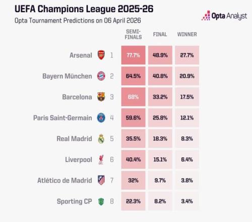 歐冠1/4決賽首回合周中開打,知名數(shù)據(jù)機(jī)構(gòu)Opta于賽前更新了八支參賽隊(duì)伍晉級(jí)四強(qiáng)的概率。