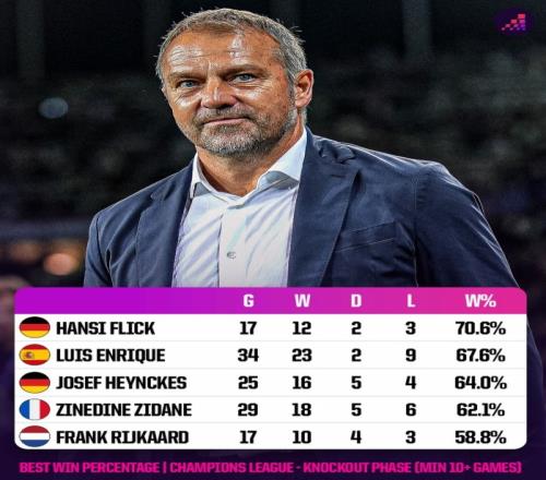 歐冠淘汰賽主帥勝率榜:弗里克17戰(zhàn)12勝居首,恩里克次席
