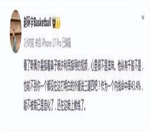 媒體人趙環(huán)宇對此發(fā)表尖銳評論,直指斯佩爾曼“配不上如此態(tài)度”:“他一個內(nèi)線命中率僅43.4%、表現(xiàn)遠(yuǎn)未達(dá)預(yù)期的外援,能在CBA留隊已是僥幸,竟敢對一位為中國女籃重振雄風(fēng)立下汗馬功勞的功勛教練指手畫腳?”他強(qiáng)調(diào),許利民曾帶領(lǐng)中國女籃從奧運會歷史最差戰(zhàn)績中突圍,奠定世界杯亞軍基石,是實至名歸的中國籃球名人堂級人物。而斯佩爾曼此前在韓國聯(lián)賽輾轉(zhuǎn),如今卻以“被雇傭者”身份對本土功勛教練施壓,令人心寒。