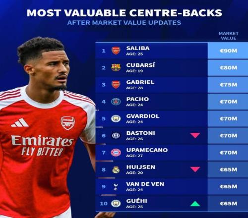 德轉(zhuǎn)列中后衛(wèi)身價(jià)前10:薩利巴9000萬(wàn)歐第1,庫(kù)巴西8000萬(wàn)第2