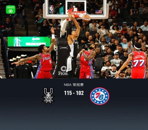 第四節(jié)馬刺迪倫-哈珀拿下5分,76人馬克西拿下8分,最終馬刺115-102戰(zhàn)勝76人
