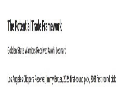 也正是這種處境上的差異,讓勇士追逐倫納德的想法,比兩個(gè)月前更加迫切,也更加有意義。蒂姆·川上透露,勇士管理層已經(jīng)明確表態(tài),休賽期將繼續(xù)積極出擊,目標(biāo)就是圍繞庫里,打造最后一次真正有競(jìng)爭(zhēng)力的沖冠陣容,而倫納德,就是他們眼中唯一能真正改變球隊(duì)上限的超級(jí)巨星。經(jīng)過多方梳理,目前流傳最廣的交易框架已經(jīng)浮出水面,堪稱一場(chǎng)大膽的3換1豪賭:勇士送出吉米·巴特勒、2026年首輪選秀權(quán)和2031年首輪選秀權(quán),從快船手中得到卡懷·倫納德。