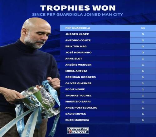 在競(jìng)爭(zhēng)最激烈的英超,這種統(tǒng)治力非常難得。阿森納、利物浦、切爾西和曼聯(lián),這些年誰(shuí)都沒少砸錢,誰(shuí)都想沖冠,但真正能保持年年?duì)幑凇ⅹ?jiǎng)杯不斷的,到頭來(lái)還是只有瓜迪奧拉。