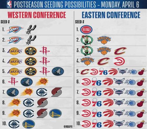 馬刺目前排名西部第二,依然還有希望成為第一。76人目前排名東部第六,最好的結(jié)果是沖到第五,最差的結(jié)果是跌至第十。事實(shí)上,除了活塞已經(jīng)鎖定東部第一,其余19支球隊的排名都有變數(shù)。尤其是東部5-10名,亂成一鍋粥了。