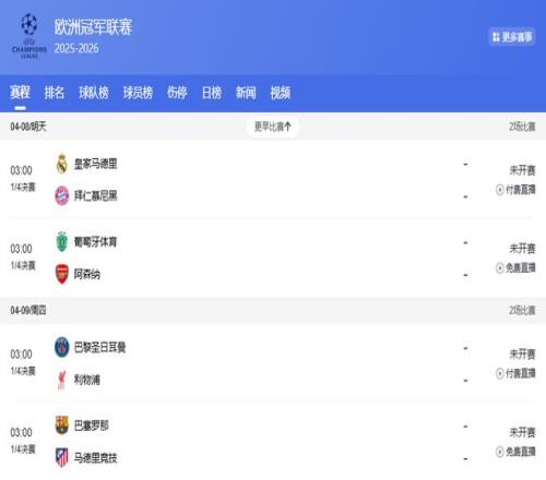 北京時間2026年4月8日至9日凌晨,2025-2026賽季歐洲冠軍聯(lián)賽1/4決賽首回合將全面打響。