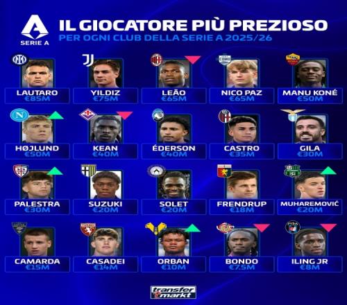 德轉(zhuǎn)意甲各隊(duì)身價(jià)最高球員:國(guó)米勞塔羅,尤文伊爾迪茲,米蘭萊奧