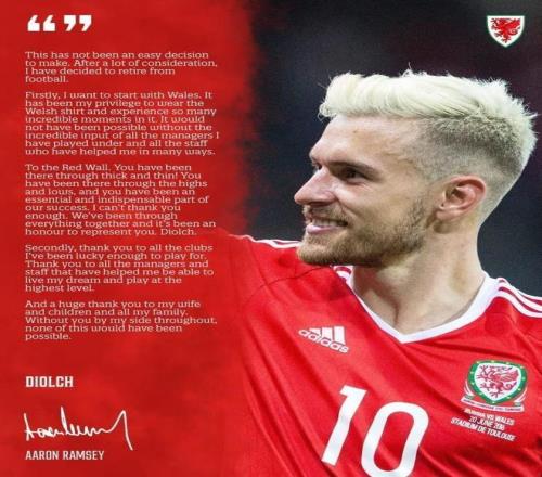 回顧拉姆塞的職業(yè)生涯,對他而言,國家隊的戰(zhàn)袍始終排在第一位。他在退役聲明中,首先感謝的正是威爾士:“這并不是個容易做出的決定。經過深思熟慮,我決定從足壇退役。首先,我想先談談威爾士。能身披威爾士戰(zhàn)袍、經歷無數精彩時刻,是我的榮幸?!?/p>