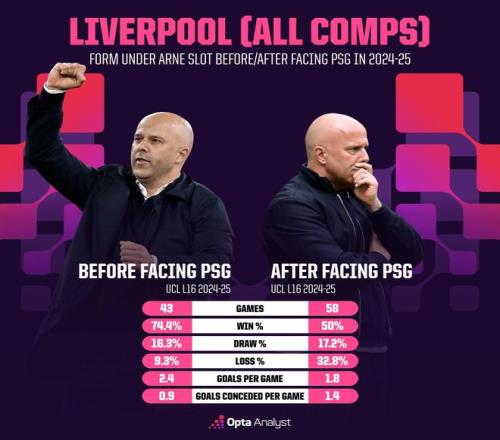 分水嶺,上賽季對(duì)巴黎前斯洛特勝率高達(dá)74.4%,此后降到50%