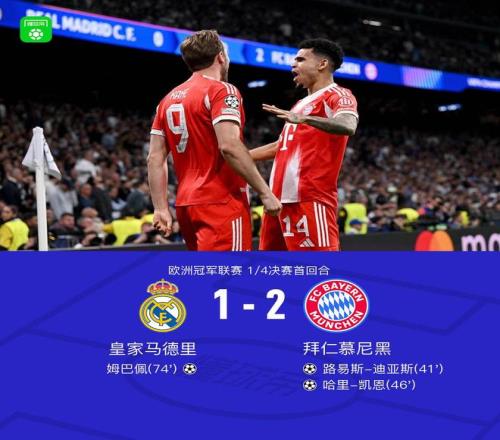 北京時間4月8日歐洲冠軍聯(lián)賽 1/4決賽首回合,皇家馬德里對陣拜仁慕尼黑?;始荫R德里姆巴佩破門。拜仁慕尼黑路易斯-迪亞斯破門,哈里-凱恩破門。最終比分皇馬 1-2 拜仁。