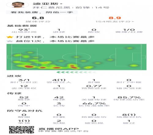 體育播報(bào)4月8日宣 在歐冠淘汰賽拜仁對皇馬的比賽中,迪亞斯破門,以下為他在本場數(shù)據(jù):