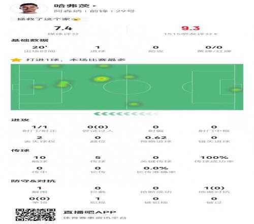哈弗茨本場(chǎng)替補(bǔ)20分鐘:1射進(jìn)1球1解圍+1犯規(guī)獲評(píng)7.4分