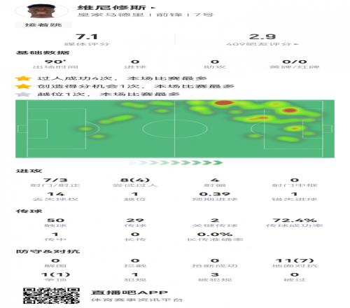 維尼修斯數(shù)據(jù):7射3正4過人,2次關(guān)鍵傳球,1次錯(cuò)失進(jìn)球,評分7.1