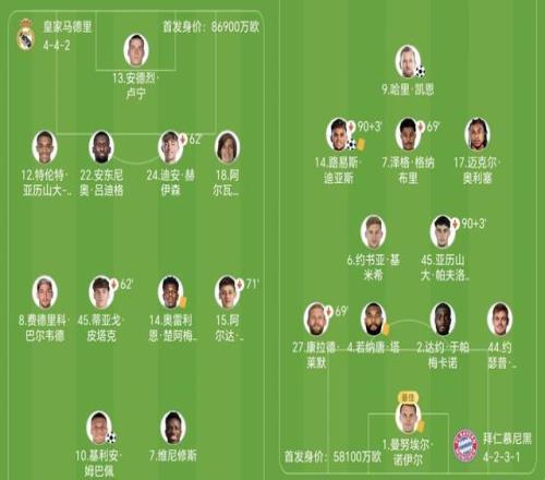 兩隊(duì)將為半決賽席位展開激烈較量,皇馬首發(fā)球員身價(jià)8.69億歐元,高于拜仁5.81億歐元,紙面實(shí)力看似較為占優(yōu)。