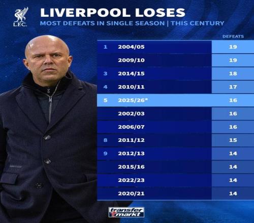 利物浦本賽季各項(xiàng)賽事已經(jīng)輸16場(chǎng),為本世紀(jì)第五多