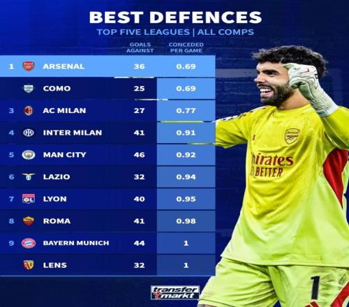 阿森納本賽季場(chǎng)均丟0.69球,與科莫并列五大聯(lián)賽球隊(duì)最低