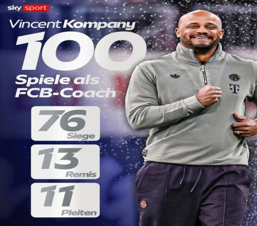 此役拜仁慕尼黑客場(chǎng)2-1擊敗皇家馬德里后,孔帕尼帶領(lǐng)球隊(duì)100場(chǎng)比賽已取得76場(chǎng)勝利(13平11負(fù))。