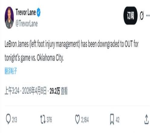 北京時間4月8日,洛杉磯湖人更新傷病報告,詹姆斯因左腳傷病管理,將缺席今天和雷霆的比賽。此外,東契奇(左腿筋拉傷)、里夫斯(左側(cè)腹斜肌拉傷)和斯瑪特(右腳踝挫傷)都不打。湖人暫列西部第四,落后第三掘金0.5個勝場。
