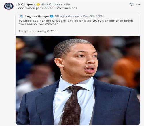 在2025年12月21日快船是6勝21負(fù),但隨后快船取得35勝17負(fù),目前戰(zhàn)績41勝38負(fù),快船官方為泰倫盧點贊,因為此前泰倫盧說余下55場比賽要拿35勝20負(fù)。