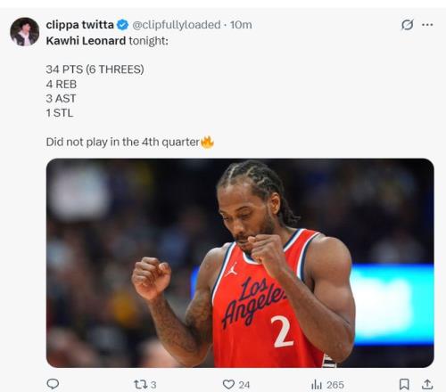 52戰(zhàn)贏35場超額完成指標(biāo)!快船官方為泰倫盧點贊:小卡三節(jié)34分