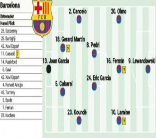 中場(chǎng):佩德里、埃里克·加西亞、奧爾莫、費(fèi)爾明、亞馬爾