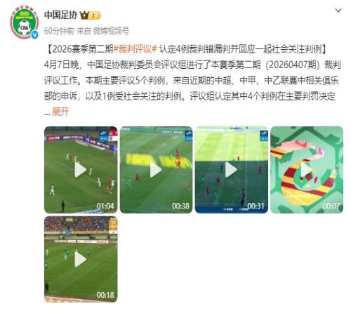 4月8日下午,中國(guó)足協(xié)公布了2026賽季第二期裁判評(píng)議結(jié)果,認(rèn)定4例裁判錯(cuò)漏判,并回應(yīng)一起社會(huì)關(guān)注判例。其中,與中超賽場(chǎng)有關(guān)的3個(gè)判例中,2個(gè)出現(xiàn)錯(cuò)漏判。