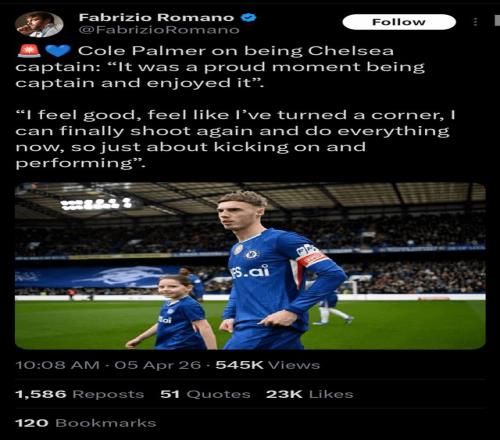 切爾西客場(chǎng)3-1擊敗阿斯頓維拉,帕爾默首發(fā)出戰(zhàn)并戴上隊(duì)長(zhǎng)袖標(biāo)。這是他職業(yè)生涯第一次以隊(duì)長(zhǎng)身份代表切爾西出場(chǎng),距離他加盟球隊(duì)才過(guò)去一年半。