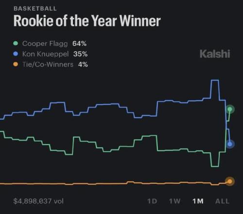 在克尼普爾撞上新秀墻、弗拉格大爆發(fā)之前,我們本以為,本賽季的最佳新秀已經(jīng)沒(méi)有懸念,然而現(xiàn)在懸念又重新回來(lái)了,克尼普爾甚至落于下風(fēng)——弗拉格51分+45分之后,他的最佳新秀概率已經(jīng)反超了克尼普爾。